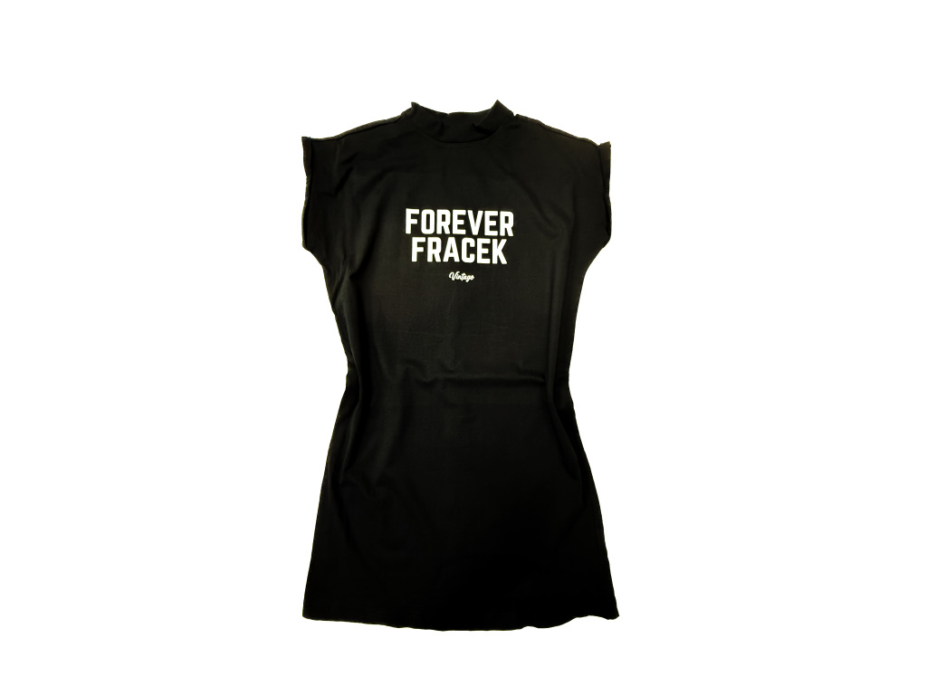 Šaty ležérního střihu s potiskem termotransferu na předním díle. Případný čtverec mírně odlišné barvy okolo designu po vyprání zmizí.