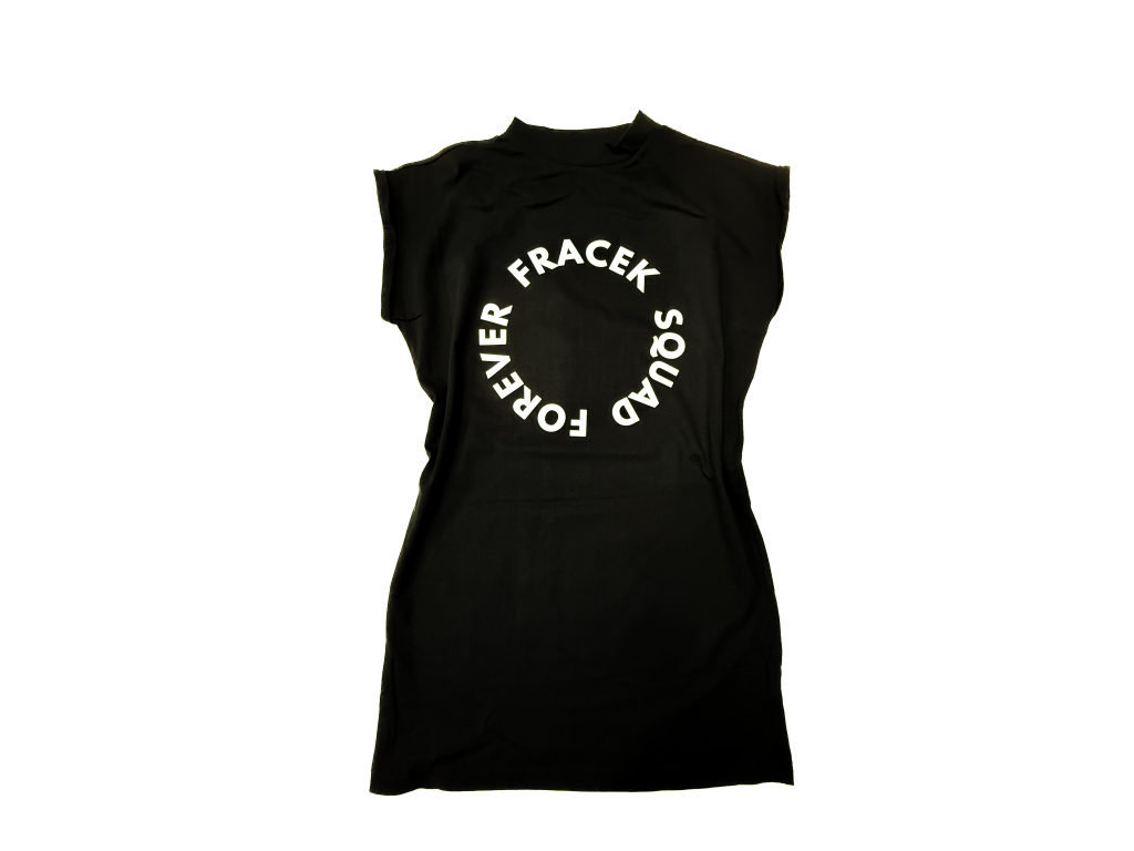Šaty ležérního střihu s potiskem termotransferu na předním díle. Případný čtverec mírně odlišné barvy okolo designu po vyprání zmizí.