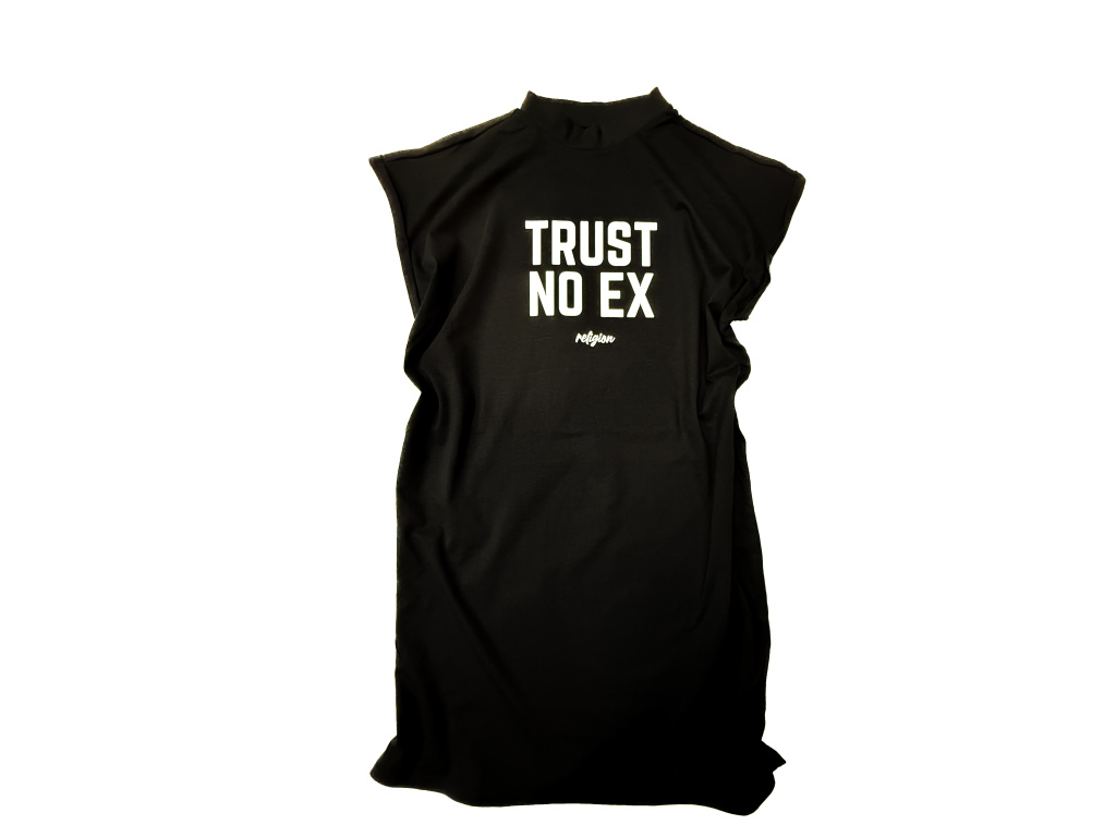 Šaty ležérního střihu s potiskem termotransferu na předním díle. Případný čtverec mírně odlišné barvy okolo designu po vyprání zmizí.