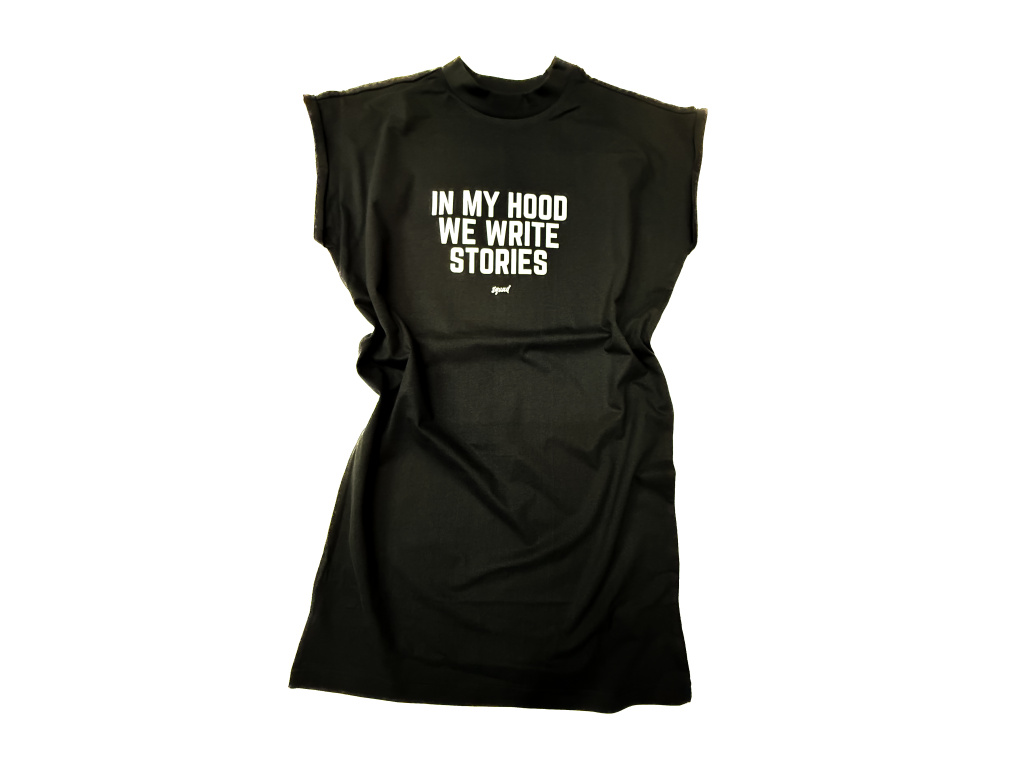 Šaty ležérního střihu s potiskem termotransferu na předním díle. Případný čtverec mírně odlišné barvy okolo designu po vyprání zmizí.
