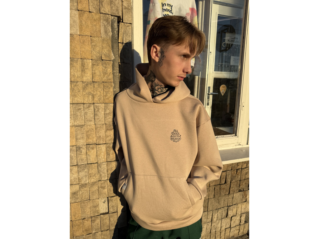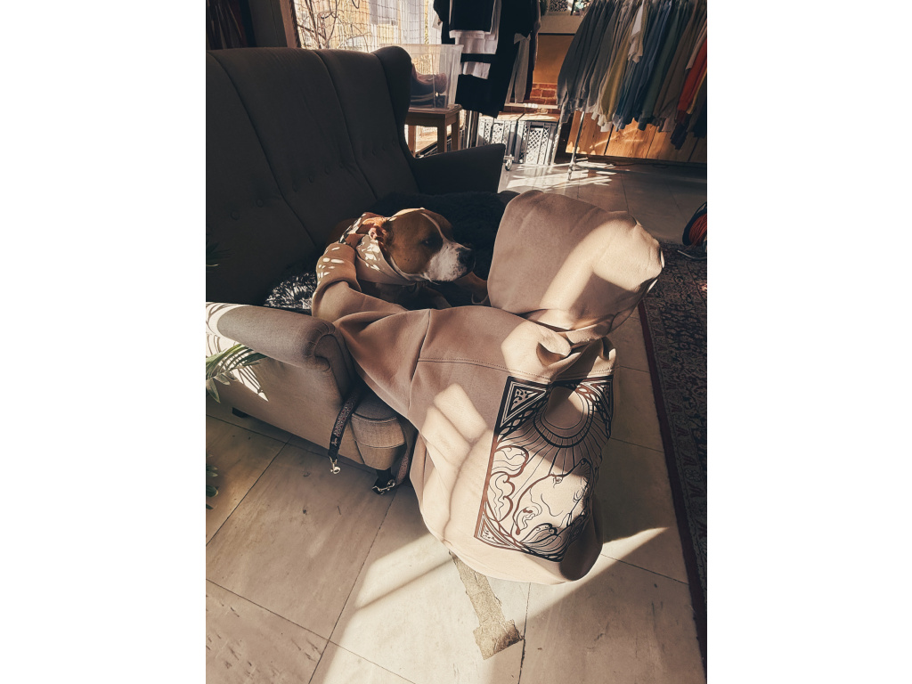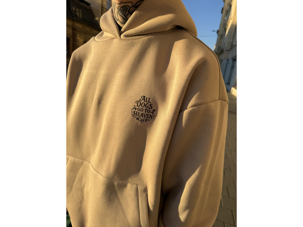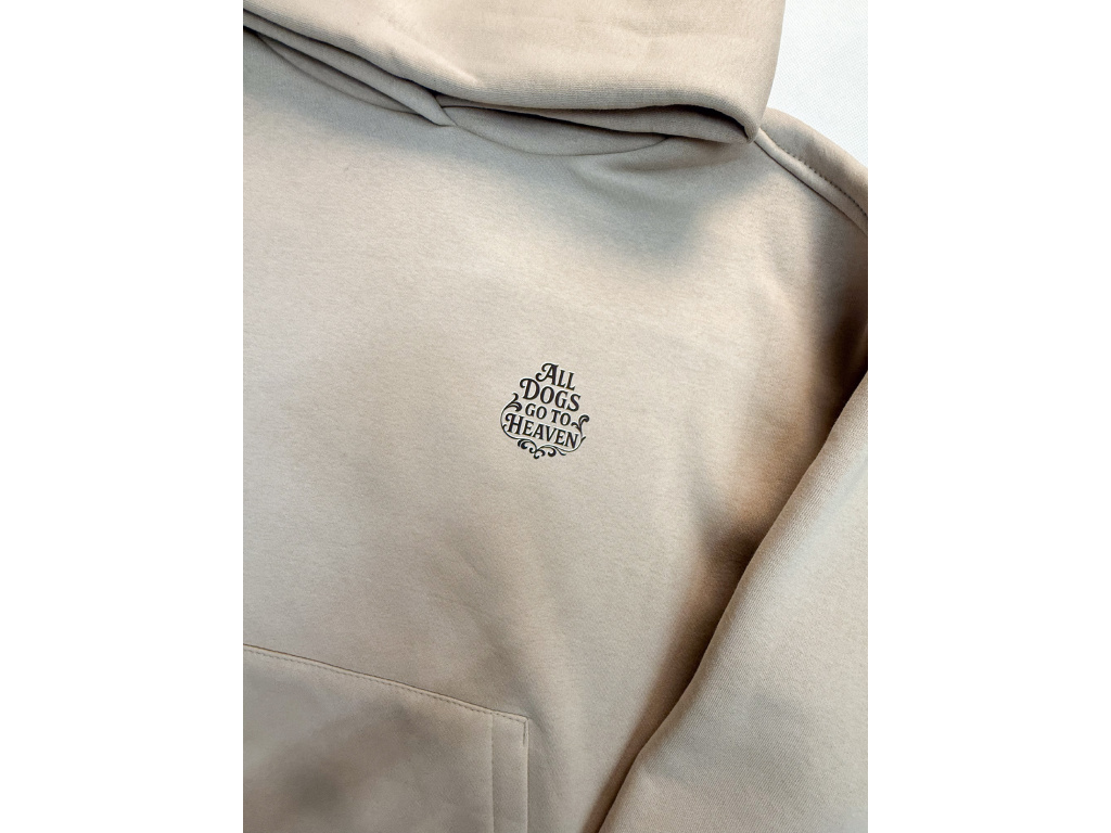 Béžová unisex mikina v jedné velikosti, rozměry viz níže. Na zadním díle potisk pejska, jehož předlohou byla naše firemní fenka Maxa. Asi každý, kdo má psa bude souhlasit, že máloco na světě je tak silné jako právě láska psa. Je to náš hold vzdaný těmto stvořením, pro která jsme to nejdůležitější, co v životě mají. Na předním díle text All Dogs Go to Heaven (všichni psi příjdou do nebe). Možno zakoupit také šátek pro Vašeho miláčka se stejným potiskem